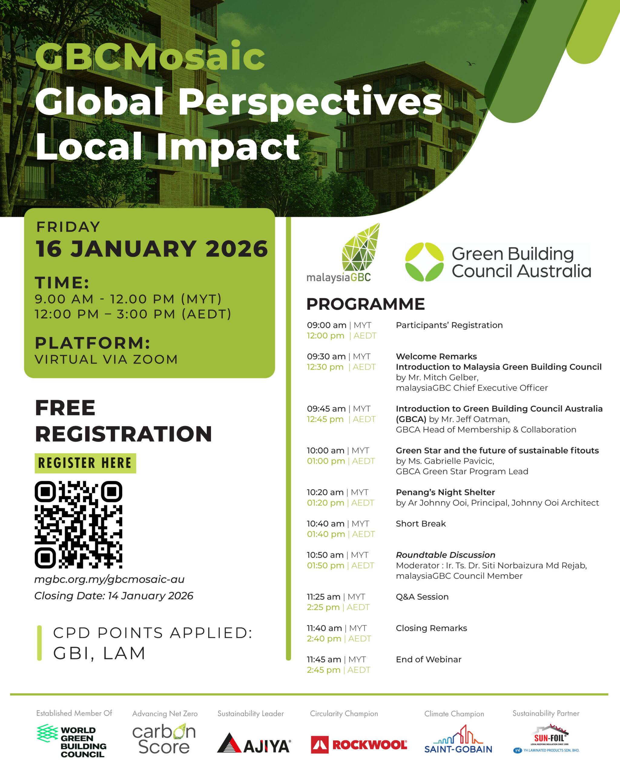 We’re starting 2026 with a global conversation.Mark your calendar! Join us for the GBCMosaic Webinar Series, connecting global perspectives with local impact. A special online showcase by malaysiaGBC & Green Building Council Australia (GBCA), exploring insights, innovations, and case studies shaping the future of sustainable green building design. Webinar Topic: